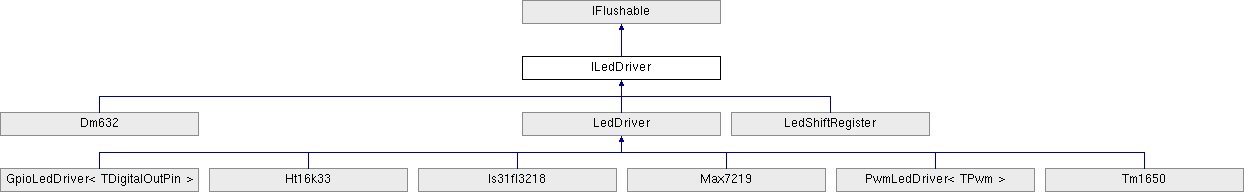 Implemented in Max7219, Pca9685, LedDriver, BarGraph, ChainableShiftRegisterOutput, RgbLed, Tm1650, Ht16k33, GraphicDisplay, Apa102, Is31fl3218, LedDisplayCollection, GpioLedDriver< TDigitalOutPin >, and PwmLedDriver< TPwm >.